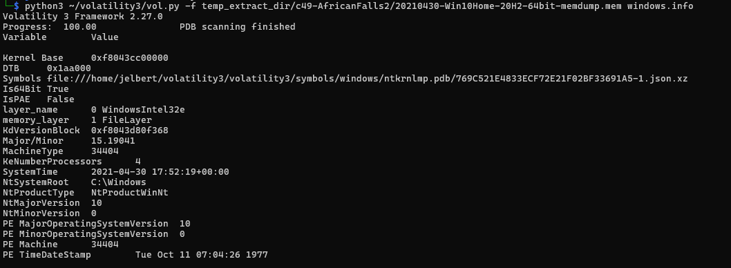 python3 ~/volatility3/vol.py -f temp_extract_dir/c49-AfricanFalls2/20210430-Win10Home-20H2-64bit-memdump.mem windows.info