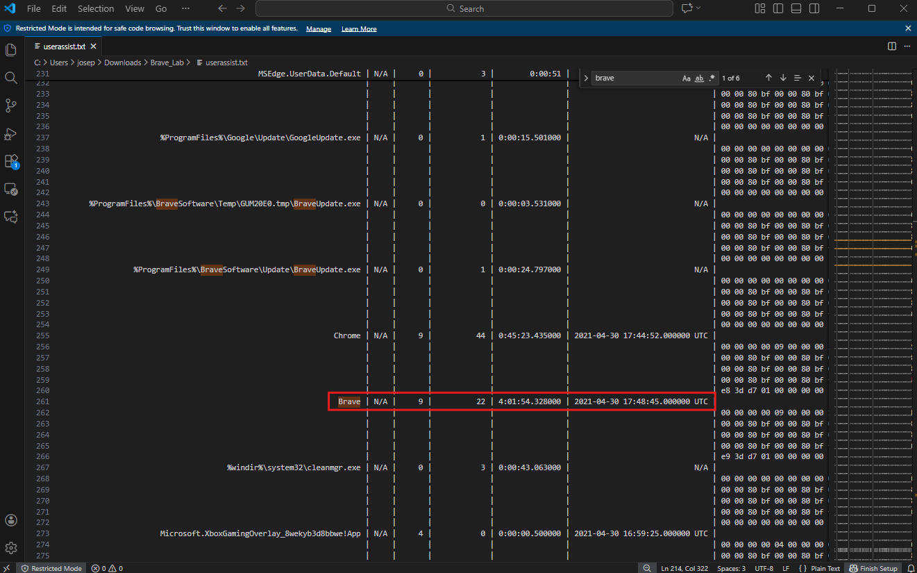 By examining the contents of the UserAssist output, the Brave browser entry was located. The runtime duration associated with this app instance was 04:01:54. This data provides a clear indication of how long the application was active during the time of interest.