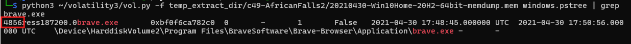 python3 ~/volatility3/vol.py -f temp_extract_dir/c49-AfricanFalls2/20210430-Win10Home-20H2-64bit-memdump.mem windows.pstree | grep brave.exe