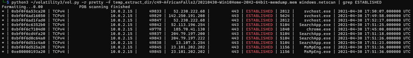 python3 ~/volatility3/vol.py -r pretty -f temp_extract_dir/c49-AfricanFalls2/20210430-Win10Home-20H2-64bit-memdump.mem windows.netscan | grep ESTABLISHED