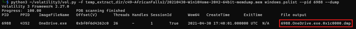 python3 ~/volatility3/vol.py -f temp_extract_dir/c49-AfricanFalls2/20210430-Win10Home-20H2-64bit-memdump.mem windows.pslist --pid 6988 --dump