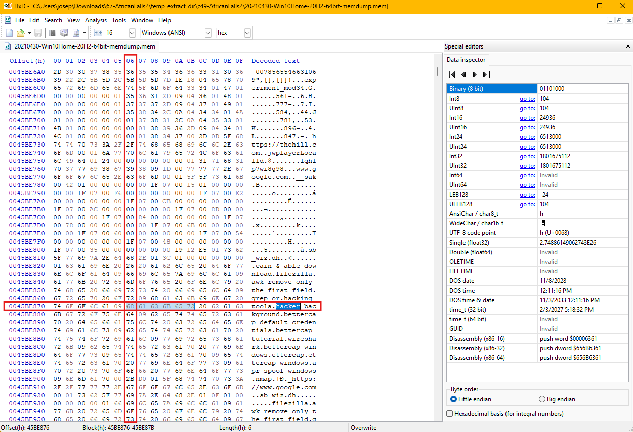 In this instance, the hex editor was used to open the memory dump file and navigate to the specified offset, 0x45BE876. The offset represents an exact location in the file, and the hex editor provides an interface to easily locate it. Upon reaching the desired offset, the ASCII column, which translates the hexadecimal bytes into readable characters, displayed the word beginning at this location. The data clearly showed the 6-byte word as hacker.