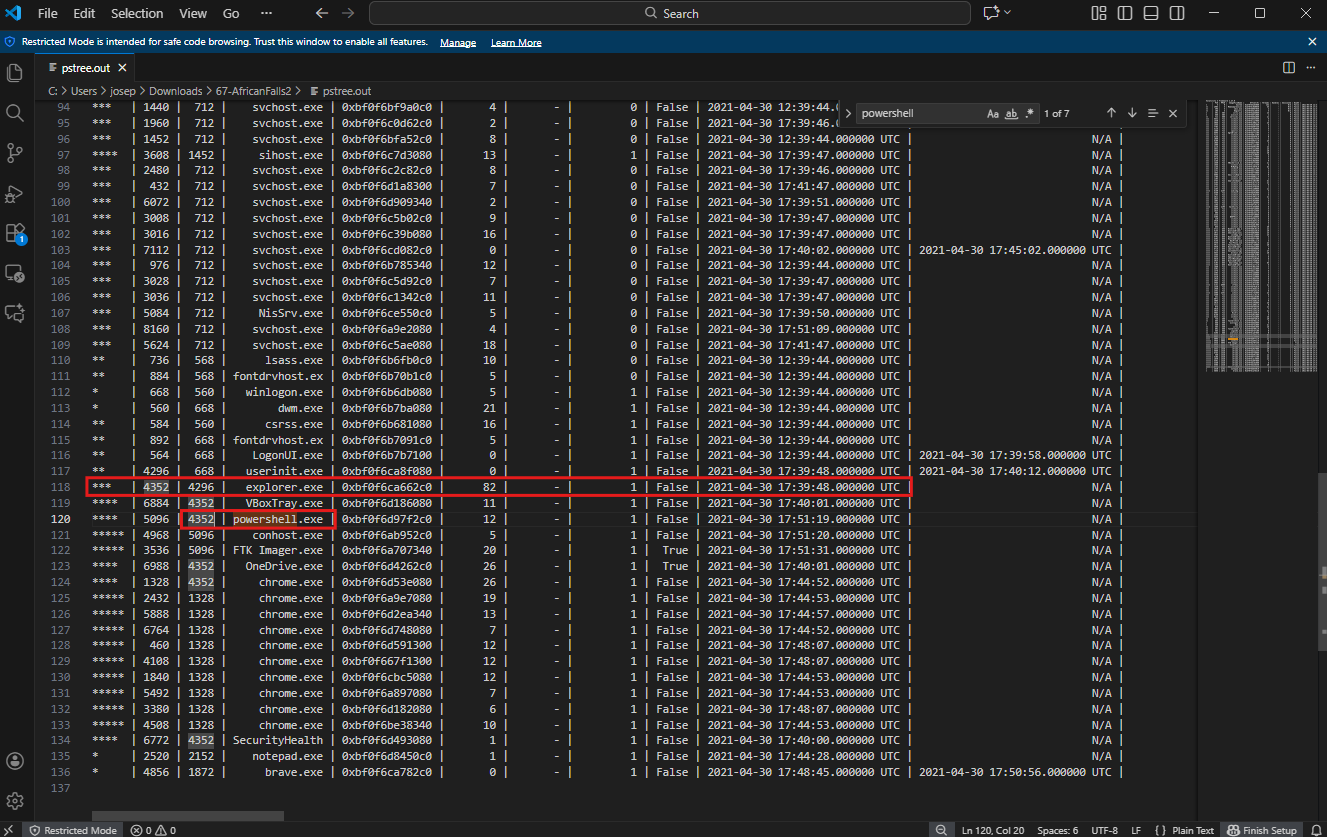 The analysis began by running the windows.pstree plugin on the memory dump, redirecting the output to a text file for easier parsing. The command executed was: