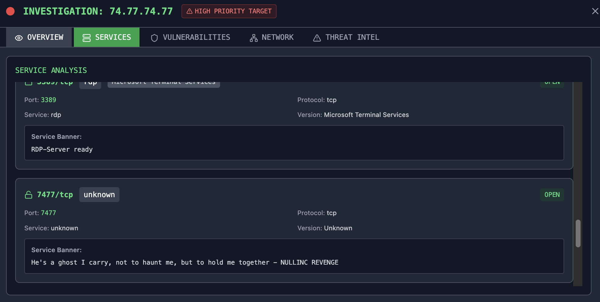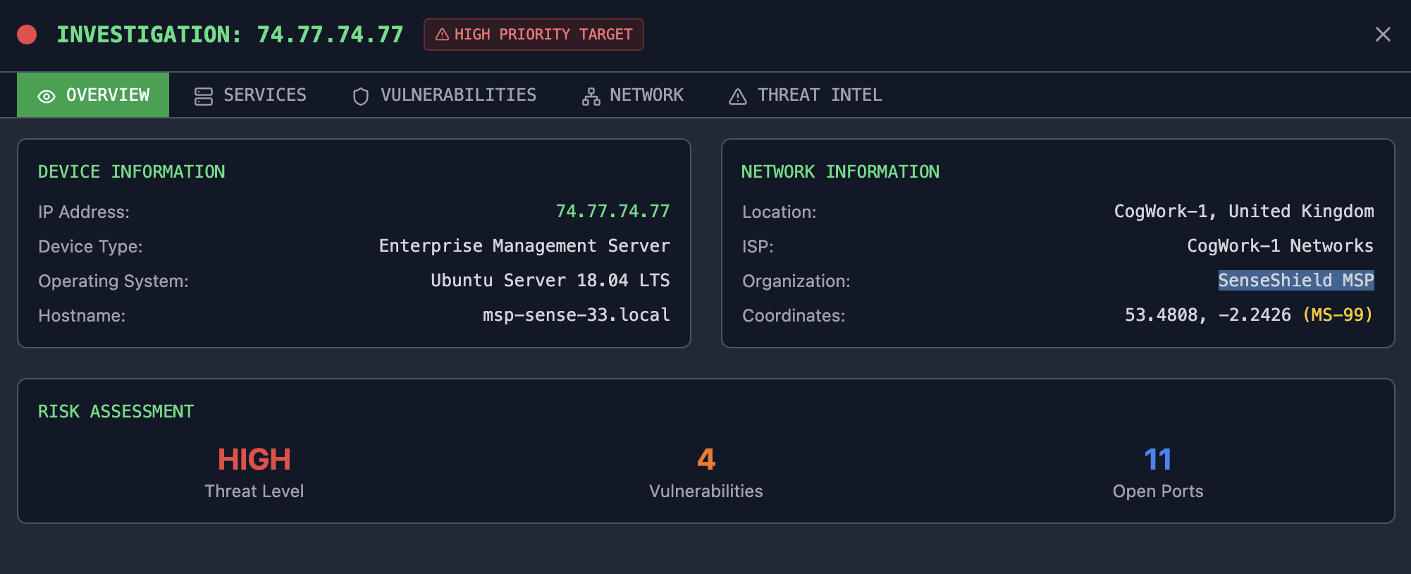 The third IP was the final docker container. I then browsed to the third IP and scanned the IP from question 8. This is the “CogNet Scanner” that scans for vulnerable machines. Under the “Overview” section, I could view the “Open Ports” and “Organization”.
