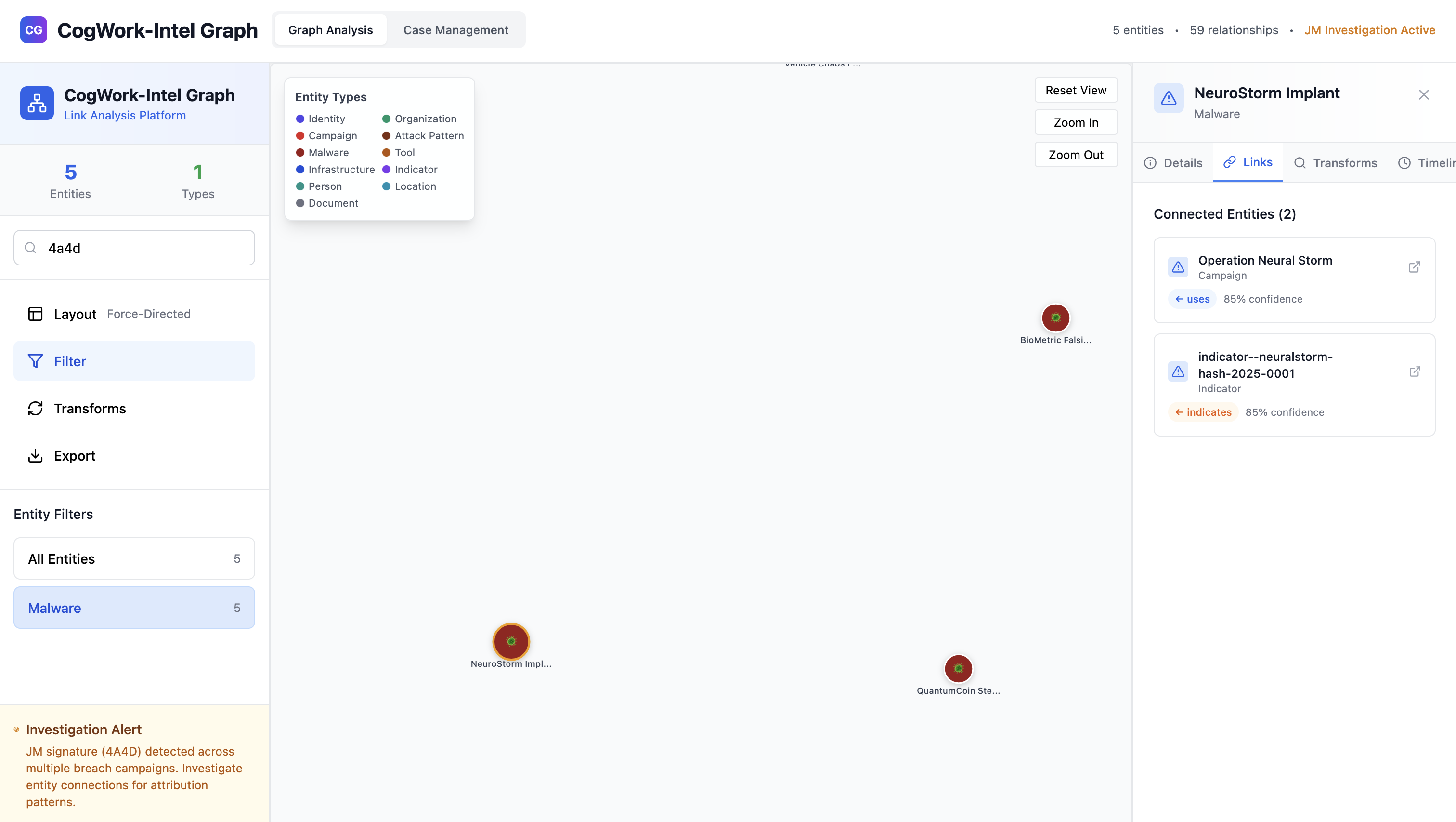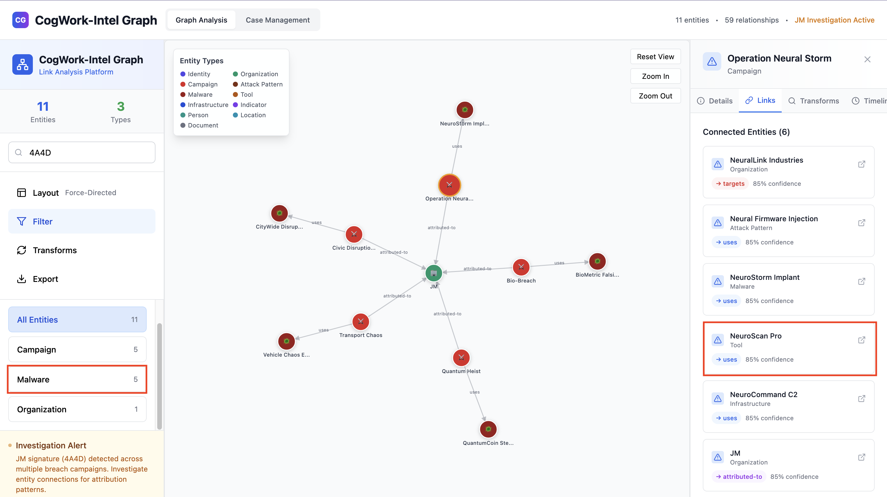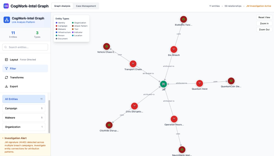 Hack the Box gave me a docker container to spin up and it gave me access to the CTI platform. The first thing that popped up was a threat intel graph. I filtered the entities using “4A4D” (the attacker’s signature from the previous question) and found out five related campaigns.