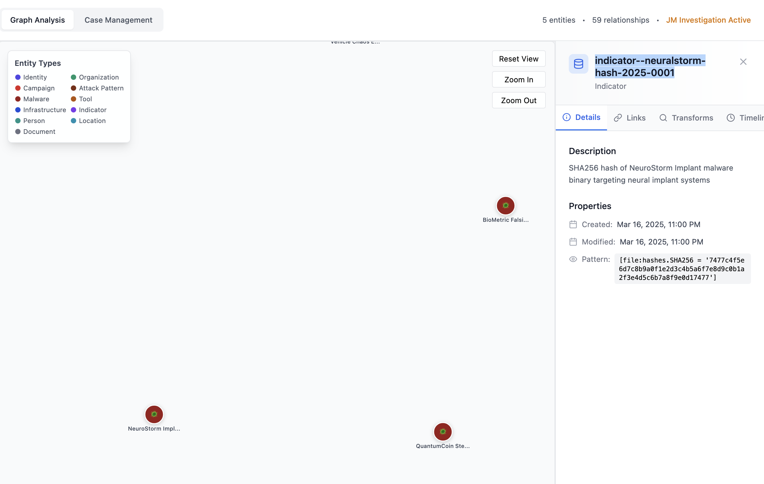 First I checked the related malware sample “NeuroStorm Implant”. I clicked on the “Links” tab and followed the “indicator–neuralstorm-hash-2025-0001”. In the “Details” tab, you can see the SHA-256 hash. All of these malware samples are the same because they all have the same hash.