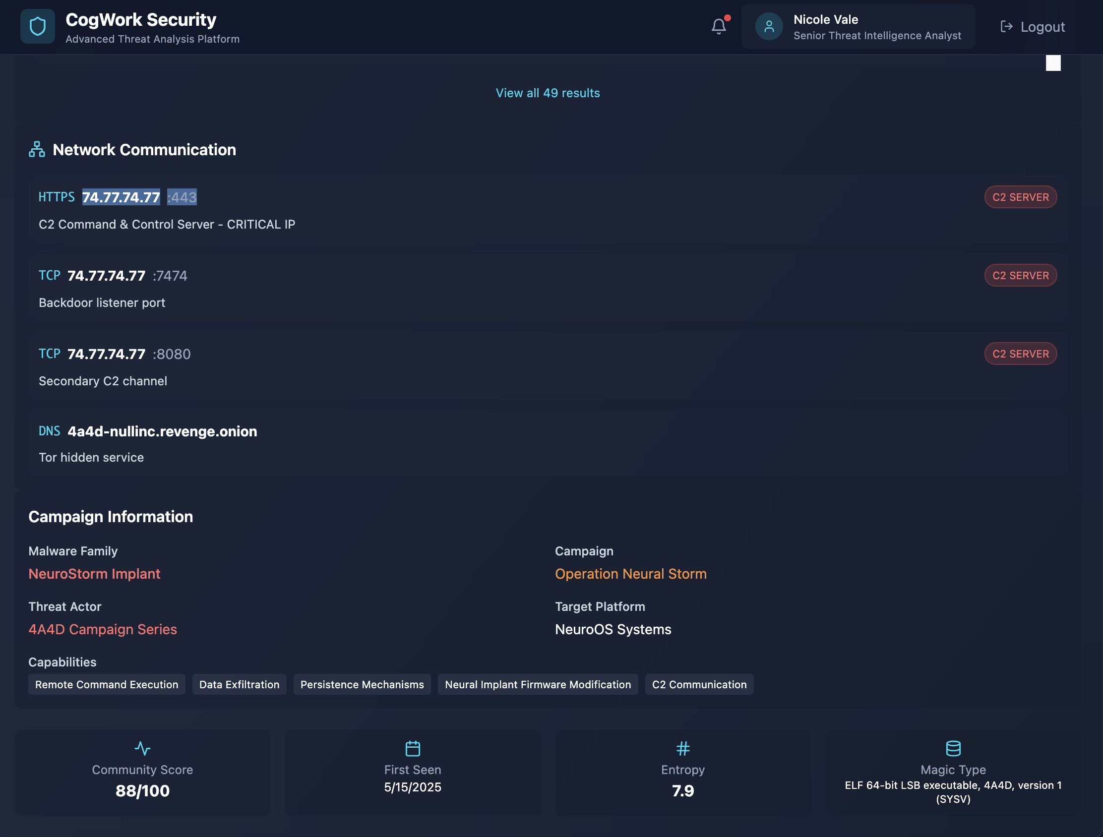 Question 8: Browse to the second IP:port address and use the CogWork Security Platform to look for the hash and locate the IP address to which the malware connects. (Credentials: nvale/CogworkBurning!)