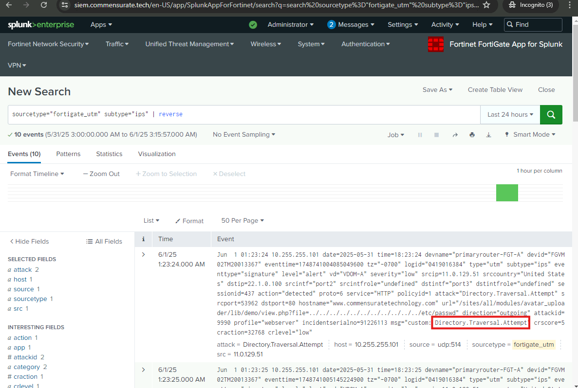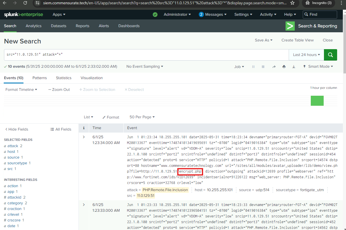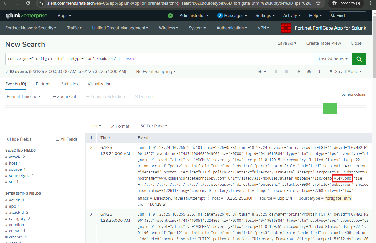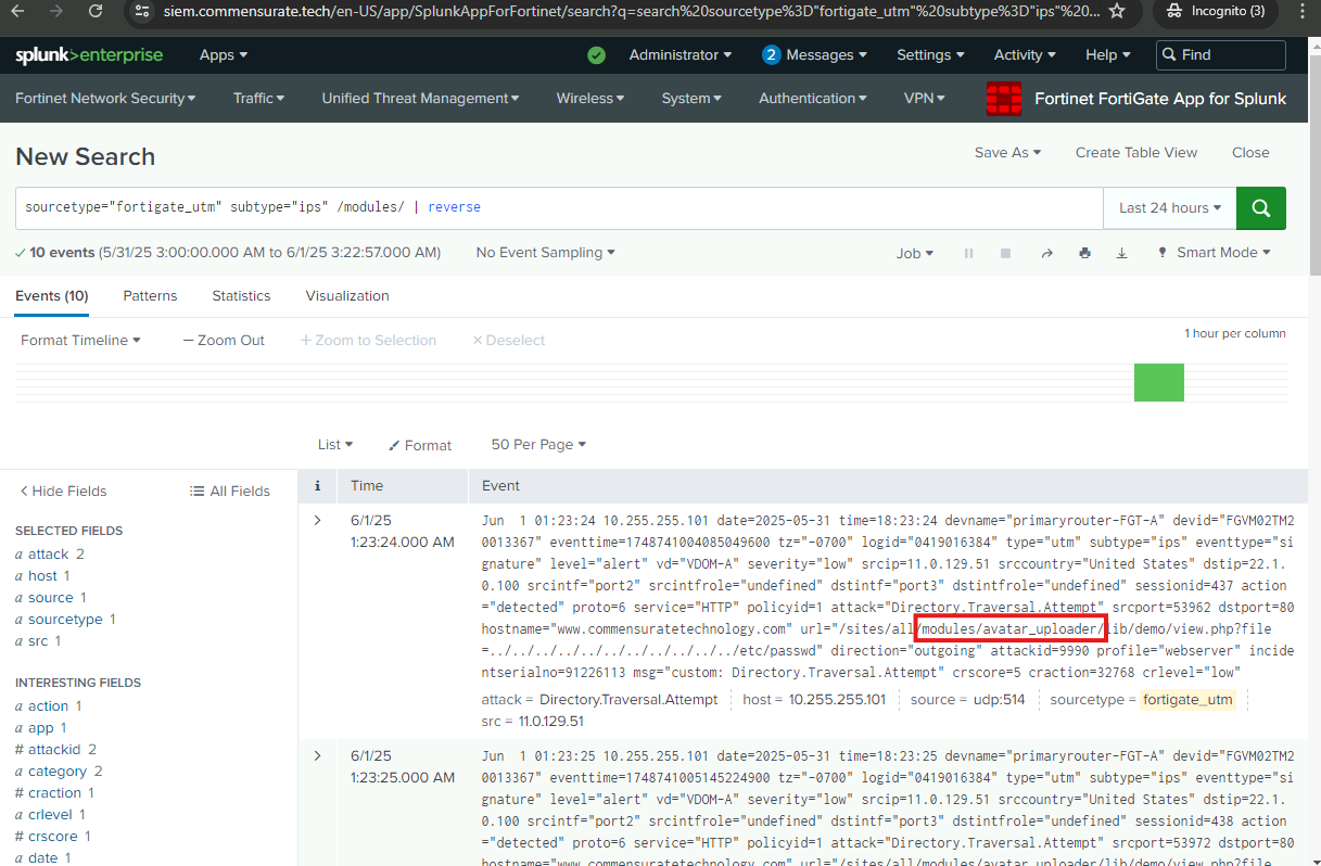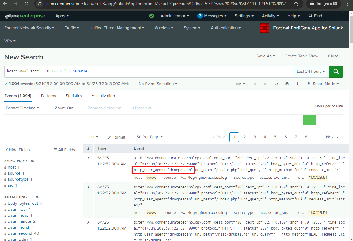 I will now examine the logs further to uncover more of the adversary’s preceding actions and identify how the attack originated. I will examine the web server logs and the FortiGate UTM logs.