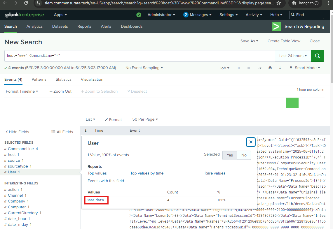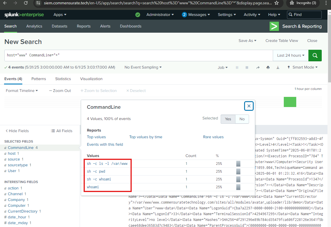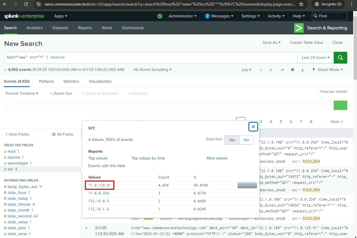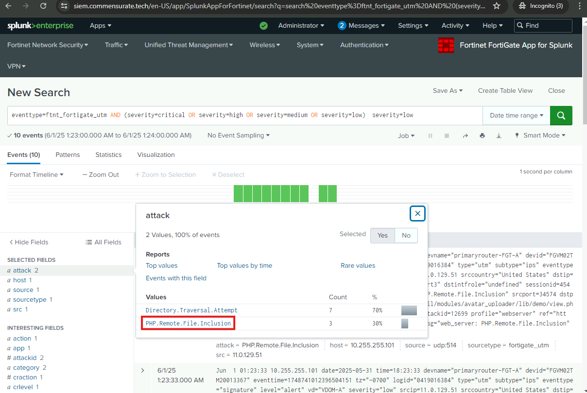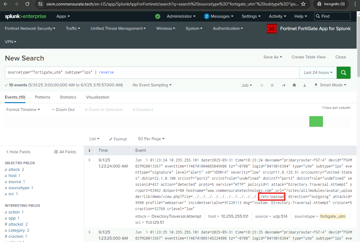 I will now examine the logs further to uncover more of the adversary’s preceding actions and identify how the attack originated. I will examine the web server logs and the FortiGate UTM logs.