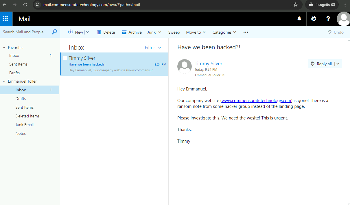I have received an email from a concerned employee regarding the company website hosting a ransom note from a hacker group.